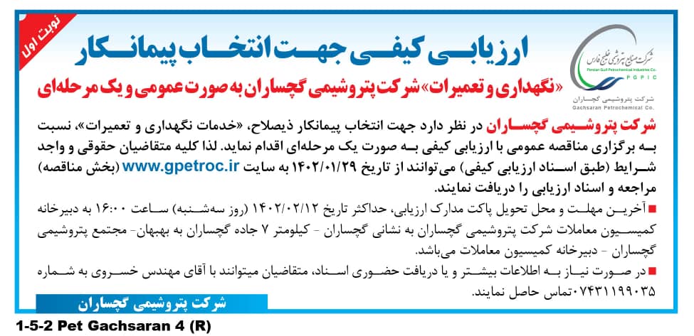 شرکت پتروشیمی گچساران در نظر دارد نسبت به برگزاری مناقصه عمومی با ارزیابی کیفی و به روش یک مرحله ای نسبت به انتخاب پیمانکار ذیصلاح جهت انجام “خدمات نگهداری و تعمیرات شرکت پتروشیمی گچساران” به شرح پیوست اقدام نماید.